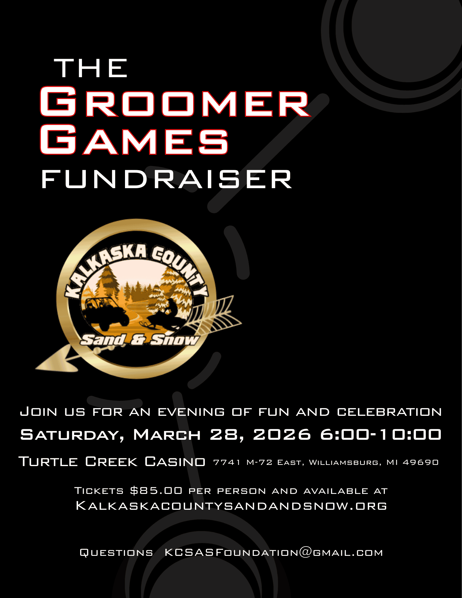 Don’t want to purchase online? You can mail your check to: KCSAS Foundation PO Box 195, Mancelona, MI 49659 and a note to indicate names and how many tickets you want to purchase.