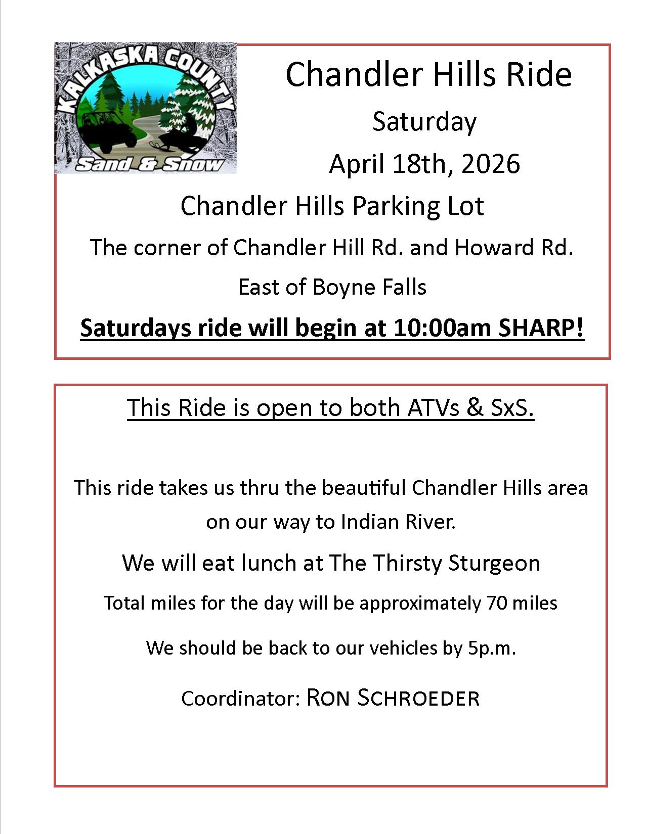 WE WILL MEET AT 10:00 AT THE CORNER OF CHANDLER HILL RD. AND HOWARD RD. EAST OF BOYNE FALLS.
