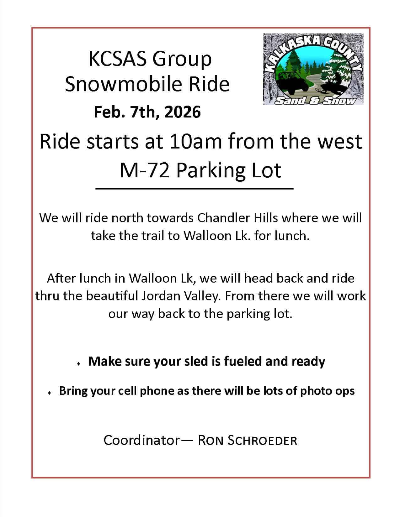 KCSAS Group Snowmobile Ride Members Only February 7, 2026 Ride starts at 10am from the west M-72 Parking Lot We will ride north towards Chandler Hills where we will take the trail to Walloon Lake […]